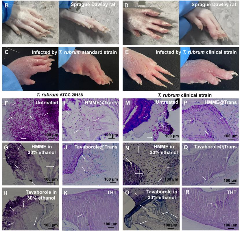 此外,为了解决新型药物筛选与评价长期缺乏甲真菌病动物模型的难题,研究团队首次建立了一种Sprague Dawley大鼠甲真菌病体内(in vivo)模型。经过THT治疗后,真菌感染清除率达到约90%。场发射扫描电镜观察发现,THT能够通过形变作用穿过甲板的微纳孔道,渗透进入甲板内部后恢复形态,实现药物的高效释放。
