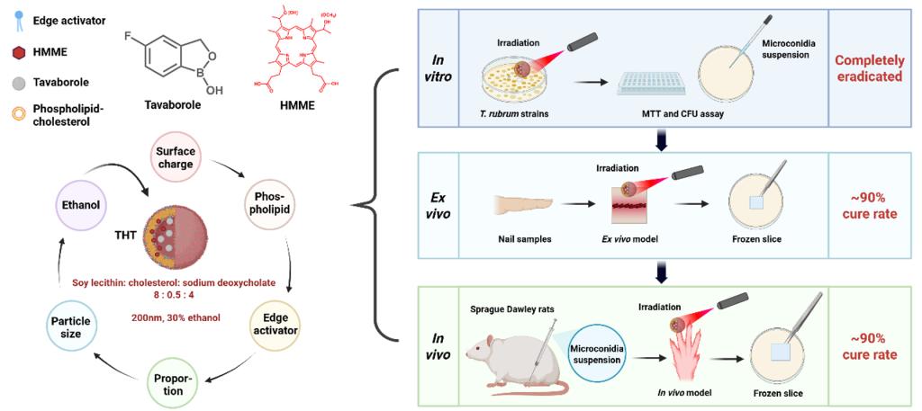 针对上述治疗难题,西安交通大学“基础与临床交叉”感染性疾病光动力诊疗研究团队设计并构建了一种新型传递体(Transfersome)药物透甲递送系统(THT),用于联合递送抗真菌药物他伐硼罗(Tavaborole)与光敏药物血卟啉单甲醚(HMME),实现病甲深层穿透与化学-光动力协同治疗。研究结果表明,该递送系统粒径约为200纳米,表面带负电荷,具备良好的稳定性,可将药物的透甲效率提升约330倍。