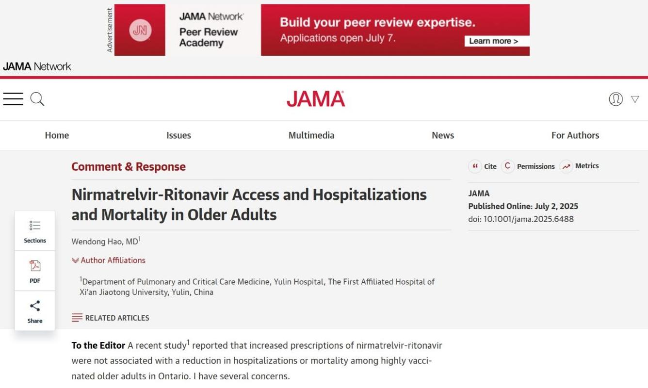 西安交大一附院榆林医院郝文东博士团队基于对新冠抗病毒药物最新研究进展的系统梳理与临床实践经验的深度总结,结合大量文献数据支撑,向JAMA提交了学术评论文章,围绕原研究结论的科学性与临床适用性展开严谨质疑与学术探讨。