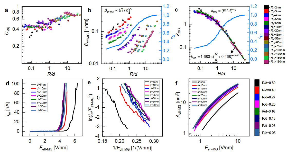 针对上述挑战,西安交通大学电气工程学院、电工材料电气绝缘全国重点实验室孟国栋教授团队在前期成果(Physics of Plasmas 31 (4) ,040502, 2024; Physical Review Letters 132 (17), 176201, 2024)的基础上,联合新加坡科技设计大学Lay Kee Ang教授团队,创新性地提出了基于透射电子显微镜的原位击穿与表征技术,系统实验研究了纳米钨电极结构(尖端半径2-190nm)在真空纳米间隙(5-100nm)的本征场致电子发射特性。首次揭示了场电子发射特征参量(开启电压、场增强因子、场增强因子与开启电压乘积等)与电极尖端曲率半径/间隙距离比值(R/d)之间的普适性关系(图1);通过对比经典的Murphy-Good场发射理论以及自洽量子模型,明确了由发射极几何形状效应引起的量子隧穿效应而非空间电荷量子效应在纳米尺度场发射中具有决定性作用(图2);最终引入与R/d强相关的几何因子kMG准确描述了纳米尺度场发射的几何形状效应,成功修正了场发射理论在纳米尺度范围存在的计算偏差,提出了适用于纳米尺度场致电子发射的普适性经验方程(图3)。研究工作首次结合原位实验和理论分析揭示了场致电子发射的纳米尺度几何形状效应,填补了经典场发射理论在纳米尺度范围的空白,为推动高性能电气装备、微纳电子器件的绝缘设计与性能优化提供了重要的理论支撑。