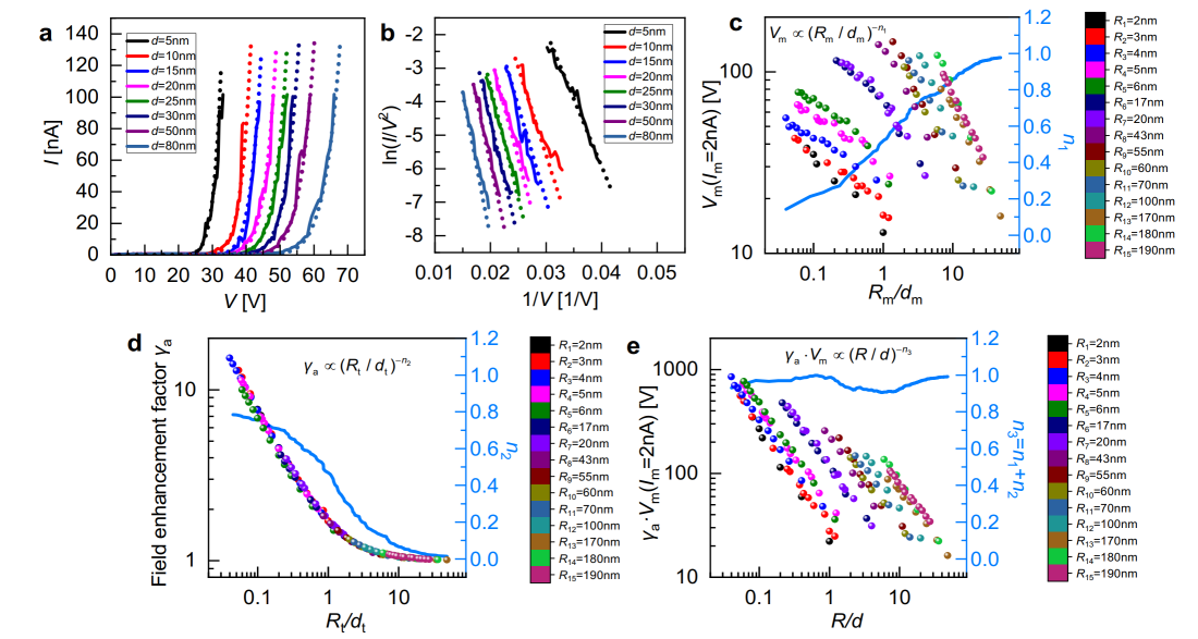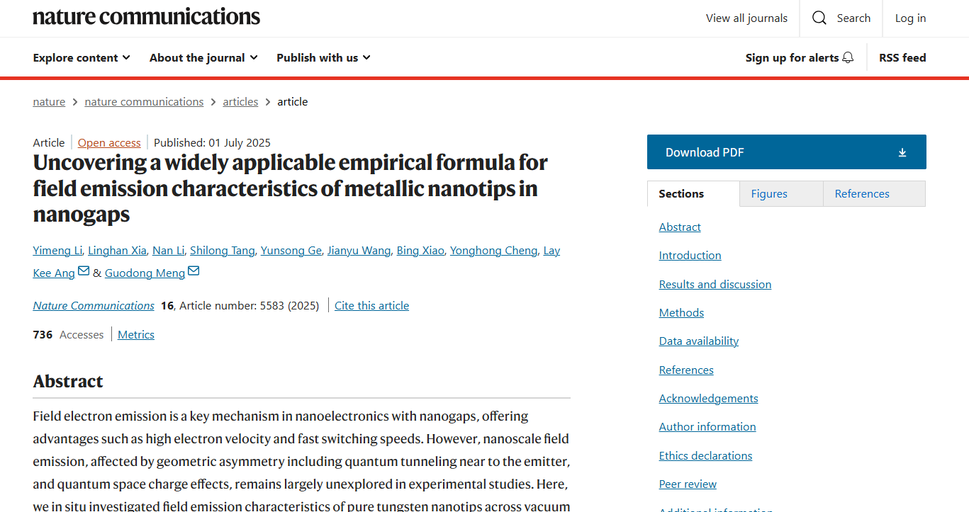 该研究成果以《揭示金属纳米尖端在纳米间隙中场发射特性的普适经验方程》(Uncovering a widely applicable empirical formula for field emission characteristics of metallic nanotips in nanogaps)为题在国际知名期刊《自然·通讯》(Nature Communications)发表,电气工程学院博士生李伊濛为论文第一作者,电气工程学院孟国栋教授为论文通讯作者,新加坡科技设计大学Ang Lay Kee教授为共同通讯作者。研究工作得到了国家自然科学基金面上项目、中央高校基本科研业务费、新加坡A*STAR AME IRG项目(M23M6c0102)、中国国家留学基金委项目等资助。西安交通大学微纳尺度材料行为研究中心(CAMP-Nano)在电镜原位测试方面,安徽泽攸科技有限公司在电镜样品杆方面对本研究给予了大力支持。