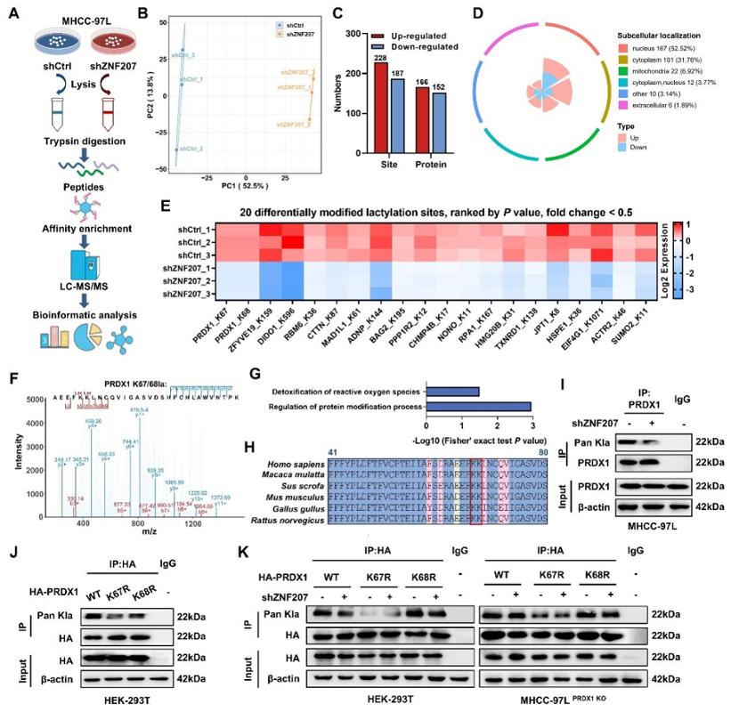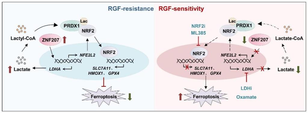 细胞代谢过程中乳酸的累积可导致蛋白质的赖氨酸残基发生乳酸化修饰,参与血管生成、糖酵解、巨噬细胞极化等多种细胞生命活动的调控,组蛋白或非组蛋白的乳酸化修饰与肿瘤化疗及靶向治疗耐药密切相关。研究团队通过4D-FastDIA乳酸化修饰组学技术结合ChIP-qPCR等方法,发现ZNF207通过促进过氧化物还原蛋白PRDX1 K67位点的乳酸化修饰,增强核转录因子NRF2的核易位,进而激活下游铁死亡抵抗信号通路,促进瑞戈非尼耐药细胞产生铁死亡抵抗;并证明了敲低ZNF207、抑制PRDX1的乳酸化修饰或NRF2激活,能够有效逆转肝癌瑞戈非尼的耐药。本研究揭示了ZNF207介导的蛋白质乳酸化修饰在瑞戈非尼耐药中的关键作用,阐明了瑞戈非尼耐药的作用机制,提出了靶向抑制ZNF207/PRDX1lac/NRF2信号轴的激活可作为一种有效克服肿瘤治疗耐药的干预策略。