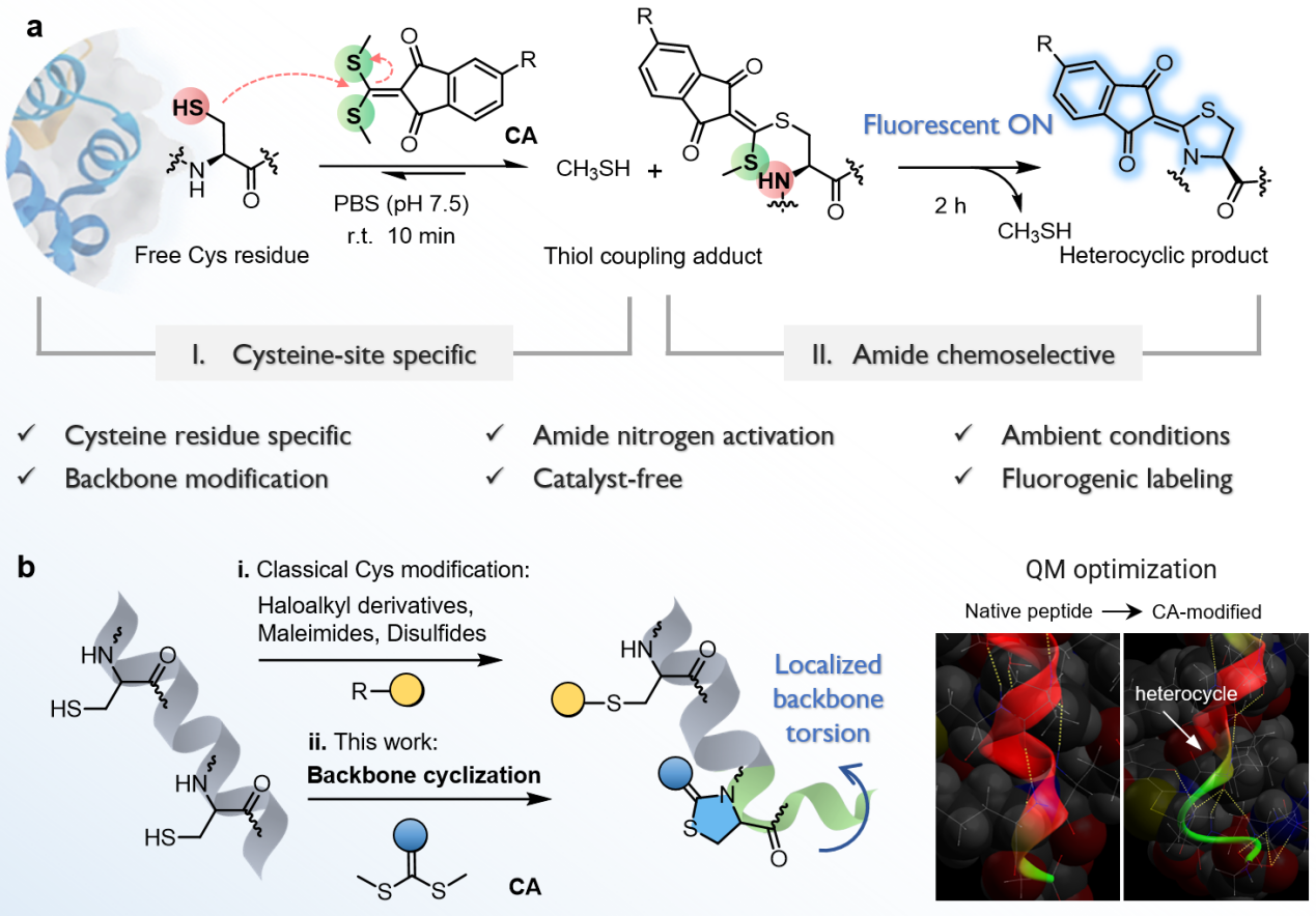 蛋白质骨架是蛋白质正确折叠与功能发挥的核心。化学修饰作为研究蛋白质结构与功能以及开发治疗性生物偶联物的重要手段,一直以来备受关注。以往的研究多集中于蛋白质的侧链或末端修饰,尽管骨架在蛋白质结构与功能中占据核心地位,但其在生理条件下的选择性化学修饰仍面临巨大挑战。自然界常通过翻译后修饰在骨架中引入环结构,以增强蛋白稳定性或赋予其荧光、酶催化活性等功能。但是,通过人为的化学手段在骨架中引入环结构仍然非常困难,一方面是由于主链酰胺键在生理条件下化学惰性强,难以活化,另一方面酰胺结构的高度相似性也使得在特定位点实现选择性修饰极具挑战。
