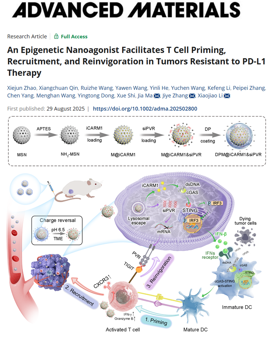 该成果以“An Epigenetic Nanoagonist Facilitates T Cell Priming, Recruitment, and Reinvigoration in Tumors Resistant to PD-L1 Therapy”(《一种表观遗传纳米激动剂介导的T细胞启动、募集与激活克服PD-L1耐药肿瘤的研究》为题发表于Advanced Materials(《先进材料》)。西安交通大学药学院博士生赵谢君为本文第一作者,药学院张继业教授、马佳助理教授与西安交大第一附属医院生物样本库李晓娇副研究员为共同通讯作者。研究得到了国家自然科学基金、陕西省自然科学基金等项目的支持。