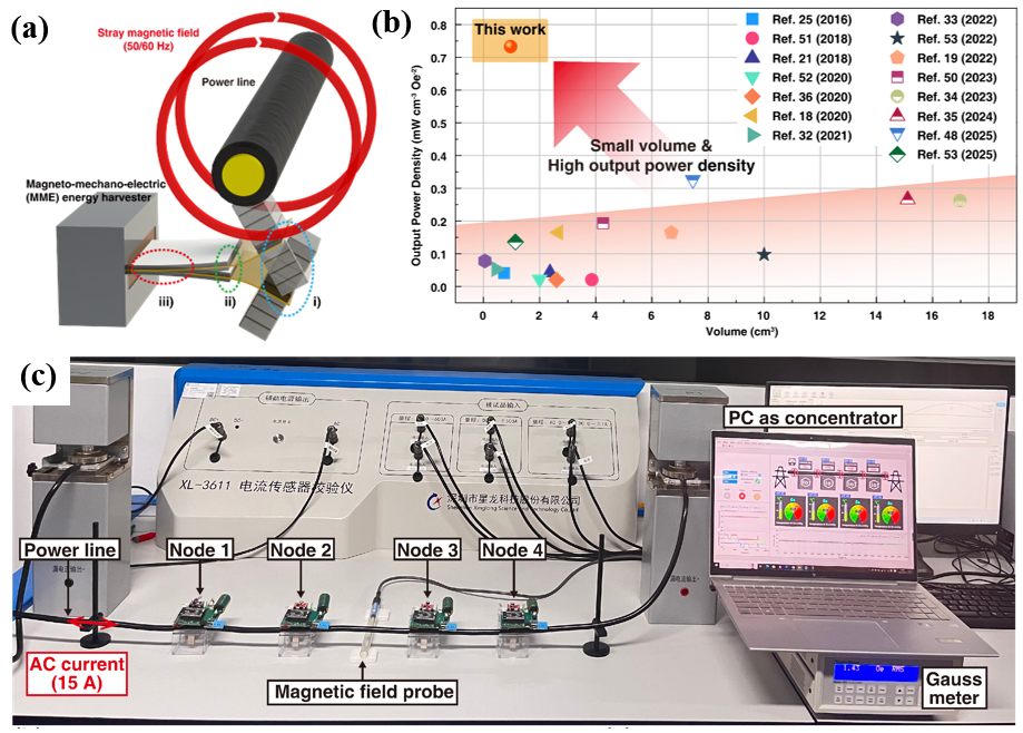 图1. 小型化磁-机-电能量收集器及自供能无线传感网络:(a)小型化磁-机-电能量收集器结构示意图;(b)磁-机-电能量收集器输出功率密度和体积对比;(c)基于小型化磁-机-电能量收集器的自供能无线传感网络。