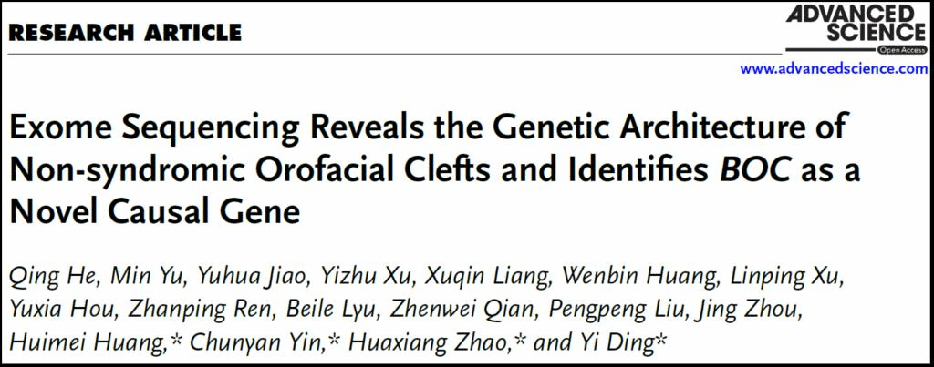 近日,西安交通大学基础医学院丁毅研究员、口腔医院赵华翔副研究员、第二附属医院尹春燕副研究员及附属儿童医院黄惠梅主任医师在国际著名期刊Advanced Science(《先进科学》)上发表了题为Exome sequencing reveals the genetic architecture of non-syndromic orofacial clefts and identifies BOC as a novel causal gene(外显子组测序揭示非综合征型唇腭裂遗传结构并鉴定BOC为新致病基因)的研究论文,该研究被选为当期Frontispiece(扉页论文)高亮推荐。