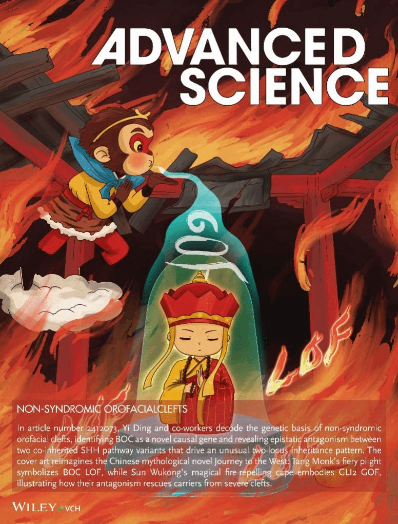 该扉页以西游记为创意灵感,形象展示了本研究发现的非综合征性唇腭裂中一种新的上位性拮抗遗传模型。图中孙悟空施展的防火罩象征SHH信号通路中GLI2基因的激活型变异(GOF),周围炽烈的火焰则代表BOC基因的失活型变异(LOF),GLI2变异的激活效应部分中和了BOC失活带来的强烈破坏作用,最终导致了较轻的唇隐裂表型——就如唐僧受到保护未被火焰灼伤。这一遗传模型不仅为非综合征型唇腭裂,也为其它复杂发育性疾病提供了新的病因学理解视角。