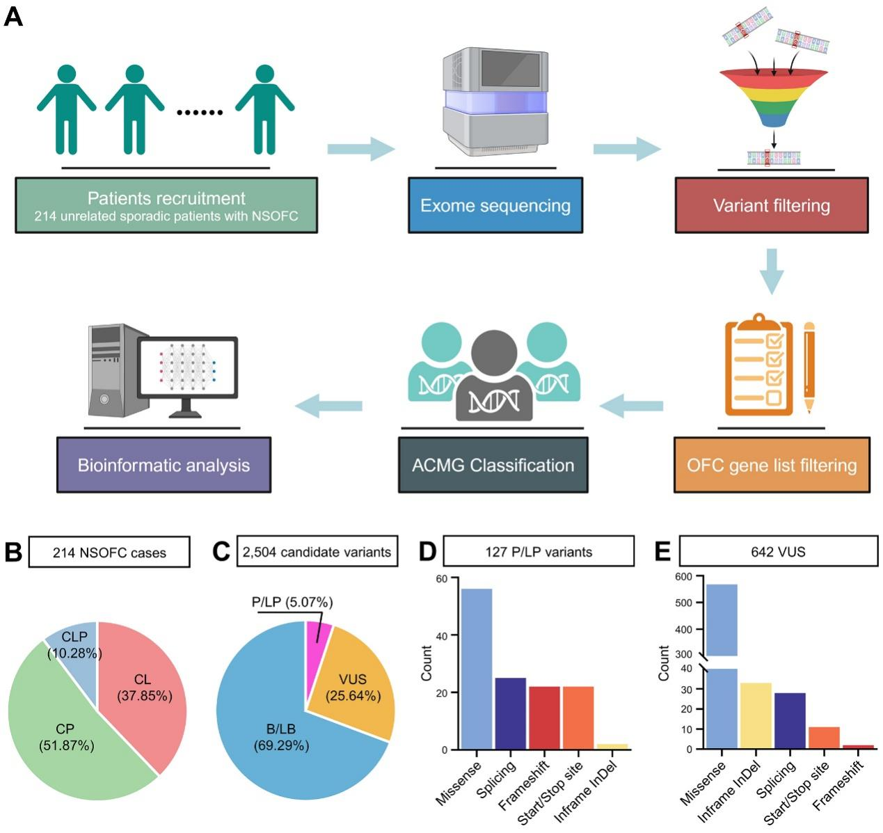 为进一步揭示非综合征型唇腭裂的罕见变异遗传结构,研究团队对来自中国西部地区的214例非综合征型唇腭裂患者进行了外显子组测序,鉴定出大量与唇腭裂发生相关的候选变异,为未来的研究提供了丰富的资源,包括位于80个基因的127个“致病/可能致病”变异——其中有11个并不包含在已报道的418个唇腭裂基因中(Diaz Perez et al., Genet Med, 2023),为新的唇腭裂致病候选基因。进一步的生物信息学分析不仅证实了非综合征型唇腭裂的等位基因异质性和遗传异质性,也提示影响唇腭裂相关信号通路的遗传变异更可能是唇腭裂的致病变异,应优先进行功能验证。