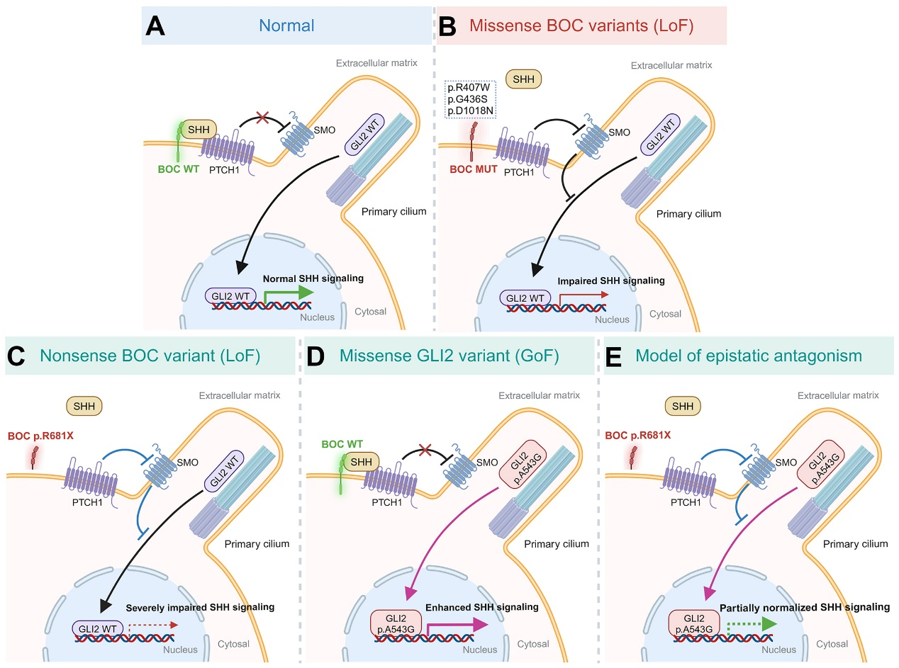 研究进一步聚焦于BOC基因的3个罕见变异,通过体外细胞实验与体内斑马鱼模型,证实这些变异均为失活型变异。更有趣的是,在一个表现为唇隐裂的遗传家系中,研究发现家系中的患者同时携带BOC的无义变异(p.R681X,一种极强的失活型变异)及GLI2的激活型变异(p.A543G)。随后的功能机制研究发现,GLI2的激活型变异可部分抵消BOC失活导致的信号下调,解释了为何携带破坏性极强失活型变异的患者却仅表现出轻微唇裂表型。