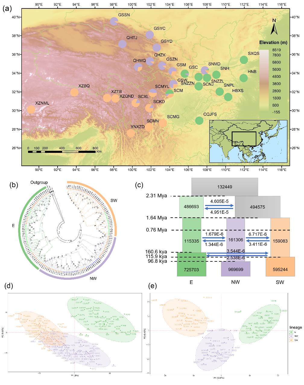 (a)采样点地理分布;(b)大黄基原植物的遗传分化;(c)谱系历史动态;(d) 大黄基原植物的基因表达分化;(e) 大黄基原植物的代谢物积累分化。