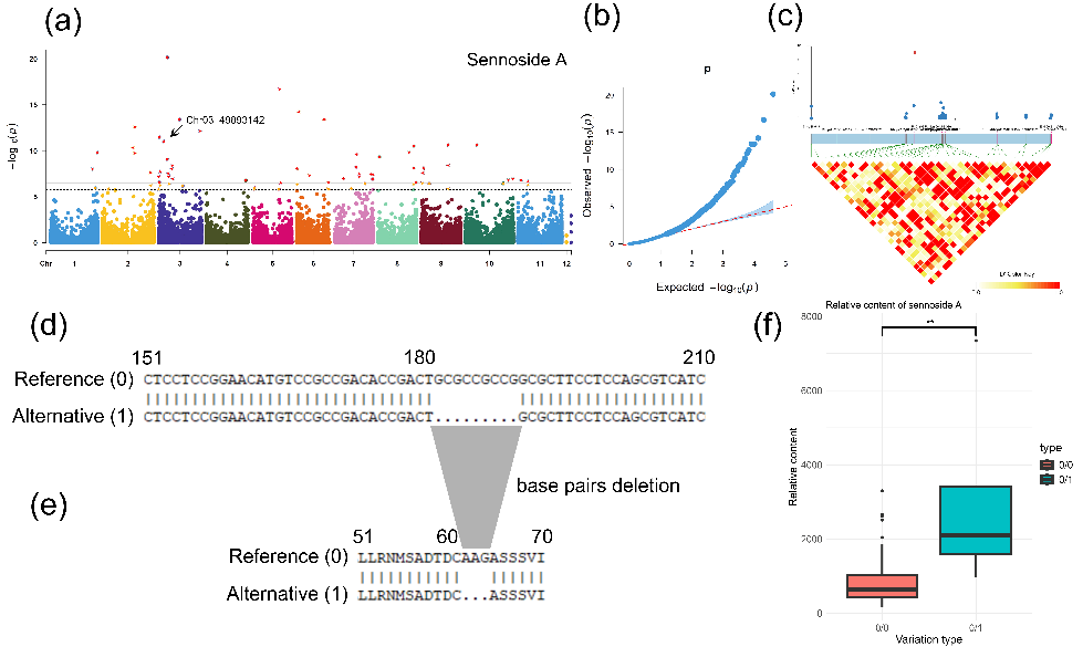 为进一步挖掘关键遗传位点,团队基于全基因组关联分析(GWAS)等方法,筛选到多个与药效成分合成调控相关的基因。其中,一个归属于UGT92基因家族的糖基转移酶基因功能尤为关键。该基因第一个外显子存在的一段碱基缺失变异,与番泻苷A含量的显著升高显著相关,且该变异特异性地富集于某一特定遗传谱系中。这一发现精准诠释了遗传变异如何直接导致药效成分差异积累的分子过程,不仅为大黄品质形成机制提供了关键证据,也为开发用于优良种质精准筛选的分子标记奠定了坚实基础,并为研究其他药用植物的品质形成机制建立了可推广的分析范式。