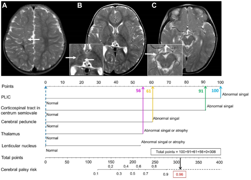 研究团队发现,内囊后肢、半卵圆中心皮质脊髓束、大脑脚、丘脑及豆状核的异常信号或萎缩,是脑瘫的五大独立预测因素。基于此,团队创新性地构建视觉列线图模型,将复杂医学影像转化为直观风险评分,风险概率一目了然。模型在383名患儿的多中心验证中表现卓越:①预测精度:外部验证队列AUC达0.92(95% CI:0.86-0.97);②临床普适性:11名不同经验医师盲测平均AUC 0.96,敏感性与特异性分别达90%和88%;③基层适配:仅需常规MRI,无需昂贵高级序列,适宜资源有限地区推广。