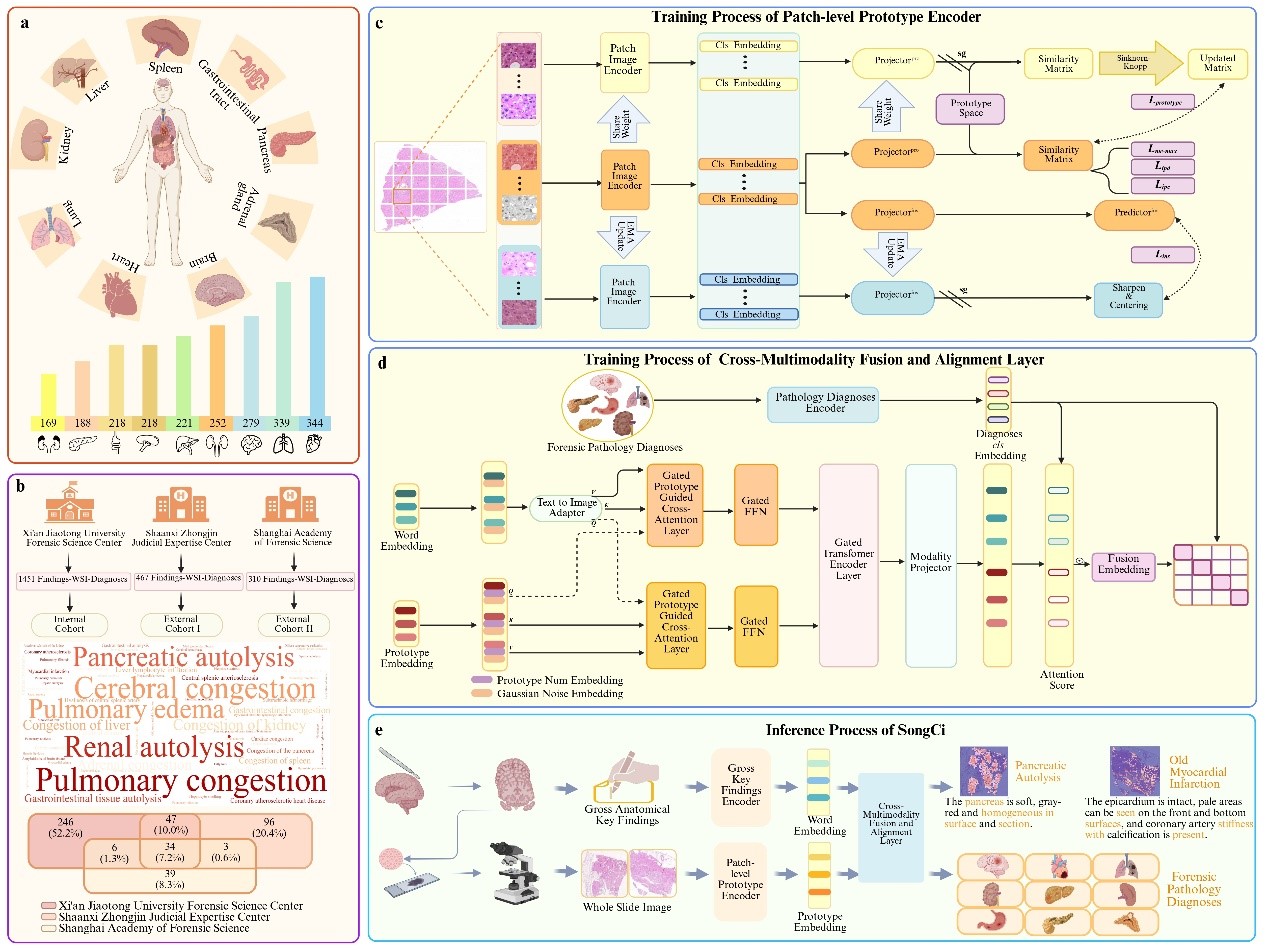 基于上述问题,西安交通大学法医学院联合数学与统计学院、生命学院科研团队,在司法部司鉴院等多个单位支持下,创新性地提出了一种专门面向法医组织病理学诊断的视觉语言多模态人工智能模型——SongCi(宋慈)。该模型采用前沿的原型跨模态自监督对比学习技术,通过深度融合图像与文本数据的特征,显著提升了法医组织病理学诊断的准确性与效率。SongCi模型首先在超过1600万张涵盖九种不同尸检器官病理变化的高分辨率病理切片图像上进行预训练,随后再利用2228对尸检全切片图像和相关尸检关键描述文本进行跨模态联合学习。通过这样的训练过程,SongCi模型能够高效地捕捉病理图像中细微的病变特征,并结合相应的文本描述,实现对病理学变化的精准识别与细致诊断。相比传统的人工诊断,SongCi模型不仅提高了诊断的一致性和客观性,还有效降低了诊断过程中的人为误差。