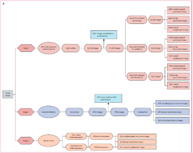 研究人员旨在研发AI辅助筛查系统,以有效地识别鼻咽癌、良性增生和正常的鼻咽图像,从而提高临床诊断率。为了评估所研发鼻咽癌筛查系统的推广能力和实用价值,研究人员在全国范围内进行了一项全面的实证研究,构建了一个具有多中心异构性质的来自全国24个省市的42家医院的鼻咽内镜图像数据集,基于此,开展了三阶段研究。