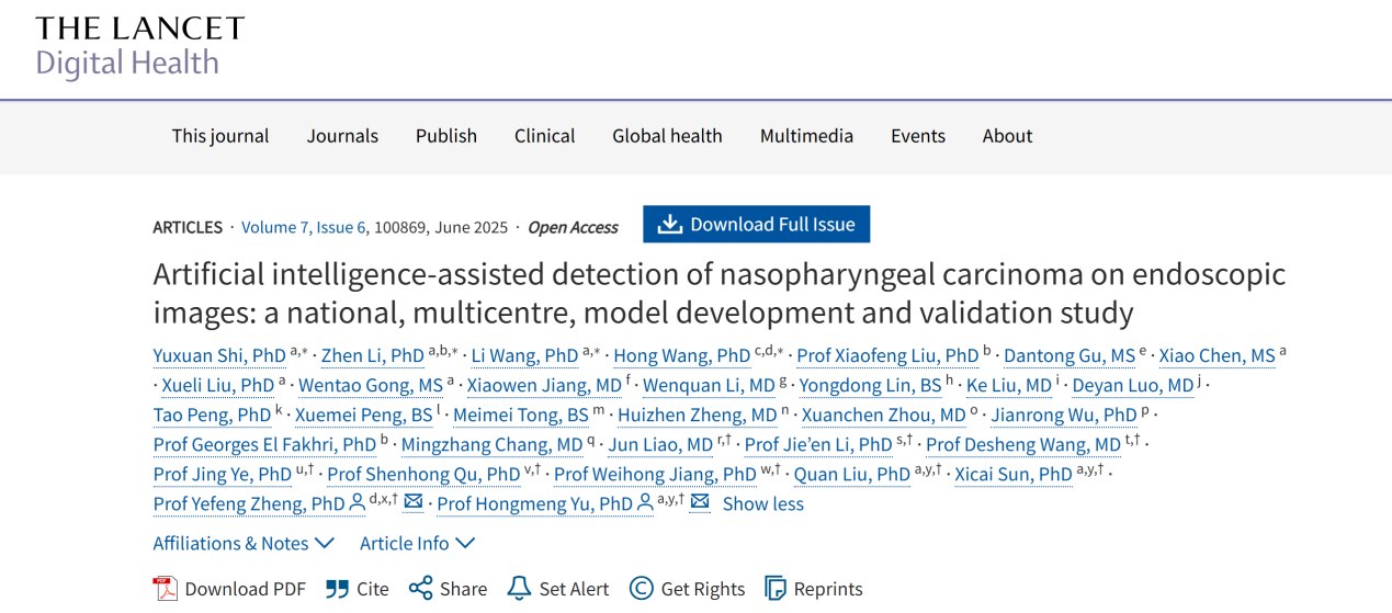 近期,由西安交通大学生命学院智能诊疗装备研究中心(IMED)王红副教授担任共同第一作者,与复旦大学附属眼耳鼻喉科医院余洪猛教授领衔的耳鼻喉科人工智能与手术机器人临床创新中心(MIRACLE Institute)、西湖大学工学院IEEE Fellow郑冶枫教授、腾讯天衍实验室进行医工交叉紧密合作,在人工智能领域国际顶级期刊《柳叶刀-数字健康》上发表了大规模真实世界研究成果,推出了具备临床应用潜力的“鼻咽癌内镜图像辅助筛查系统”,显著提升了内镜检查中鼻咽癌的识别效率与准确性。
