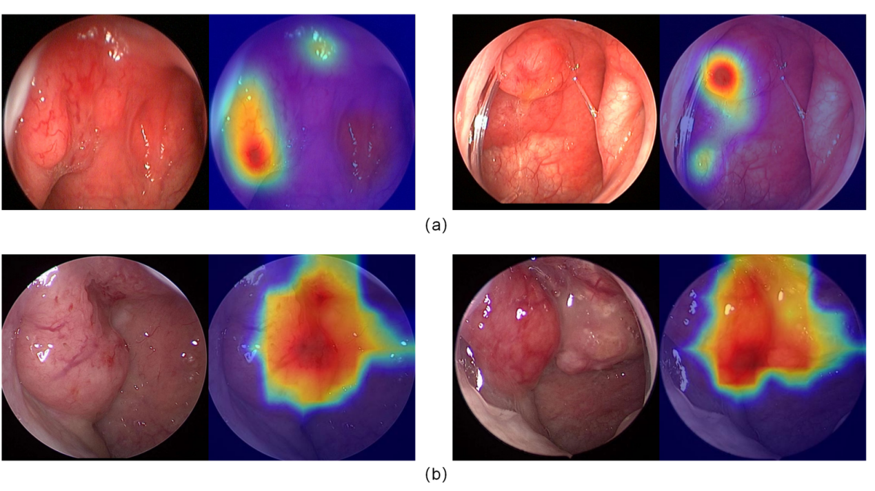 图5 内部数据集 (a) 和外部数据集 (b) 中鼻内镜图像及其梯度加权类激活图的示例