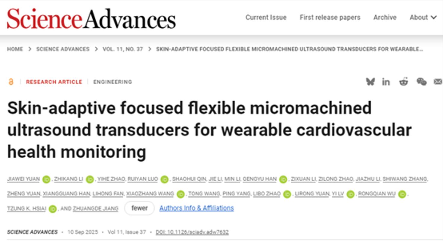 该研究成果以“Skin-Adaptive-Focused Flexible Micromachined Ultrasound Transducers for Wearable Cardiovascular Health Monitoring”(用于可穿戴心血管健康监测的皮肤自适应聚焦柔性微加工超声换能器)为题近日在Science《科学》子刊Science Advances《科学进展》上在线发表。西安交通大学博士生袁佳炜为论文第一作者,仪器科学与技术学院李支康副教授为论文共同第一作者及通讯作者,仪器科学与技术学院赵立波教授及西安交通大学第一附属医院吴荣谦教授为共同通讯作者。参与该工作的还有西安交通大学第一附属医院范力宏主任、北京大学第三医院韩耕愚医师、西安交通大学仪器科学与技术学院赵一鹤助理教授、李敏助理教授和王小章副教授以及陕西科技大学李杰老师等。该研究得到国家自然科学基金重点/面上项目、中央高校基本科研业务费-青年创新团队、陕西省科技发展计划等项目以及精密微纳制造技术全国重点实验室、国家医学攻关产教融合创新平台等基地的支持。