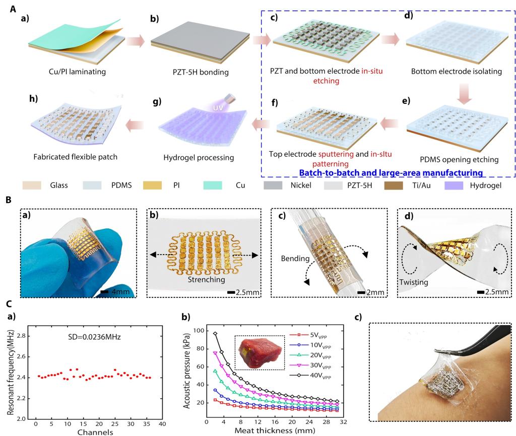 针对柔性超声器件制备中存在器件一致性差、批量化加工困难等技术瓶颈,研究团队提出了一种基于磁控溅射制备金属电极、飞秒激光刻蚀图案化压电单元以及蛇形电连接等工艺的MEMS兼容柔性超声换能器阵列制备技术,该工艺可避免现有制备技术中的大量人工操作环节,显著提升换能器结构和性能的一致性,并实现批量化与低成本制造。此外,通过UV紫外光原位固化方法制备自粘附水凝胶层,增强了换能器阵列与皮肤界面的声阻抗匹配性、生物相容性和粘附可靠性。所制备的6×6柔性超声换能器中心频率为2.4MHz,各通道谐振频率标准差小于1.0%,发射灵敏度达2.2 kPa/V,穿透组织深度大于30mm,表现出优异的加工一致性与声学性能,为柔性超声换能器的一致性、批量化制备提供了一种具有前景的技术路径(图2)。