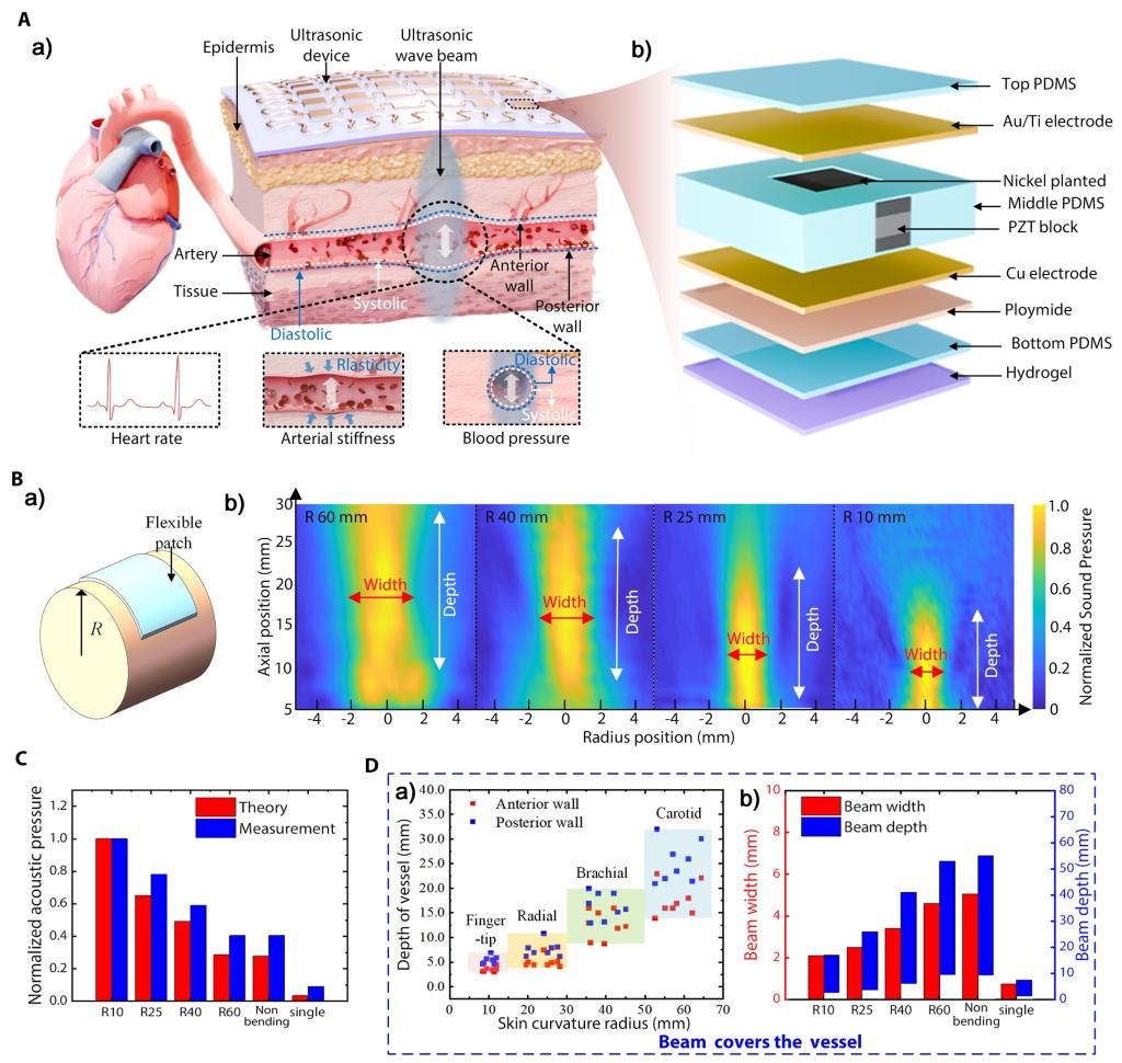 为此,中国工程院院士、西安交通大学机械工程学院蒋庄德教授,仪器科学与技术学院赵立波团队和西安交通大学第一附属医院吕毅、吴荣谦教授团队等联合研发了一种皮肤自适应聚焦柔性微加工超声换能器阵列,可共形贴附于人体皮肤表面实现血压、心率、血管刚度等血流多参数的非侵入实时、连续检测,为心血管疾病的日常监测与早期预警提供了新技术、新希望。该研究提出了一种皮肤自适应聚焦超声(Skin-Adaptive Focused Ultrasound, SAFU)血流多参数测量方法,利用全阵元同相位激励超声和皮肤固有的曲率特性实现阵列发射超声波束的聚焦,形成“橄榄球状”声束,并基于皮肤曲率与皮下血管深度和尺寸的内在关系实现聚焦声束自适应调节。通过合理的阵列结构参数设计,所研发超声阵列的聚焦声束深度和宽度范围(波束宽度为2.1—4.6 mm,穿透深度为3.3—53 mm)可随皮肤表面曲率变化,有效覆盖指端动脉、桡动脉、肱动脉和颈动脉等人体典型动脉血管区域,实现高精度、高信噪比、宽深度范围血流参数检测。该SAFU技术可以大幅简化相控阵检测技术面临的换能器结构与控制电路系统的复杂性,提高可靠性;相对单阵元检测方法声压提高10.8倍、信噪比提高19.5dB,兼顾了结构和性能优势,为基于超声飞行时间法的生理参数检测应用提供了理想途径(图1)。