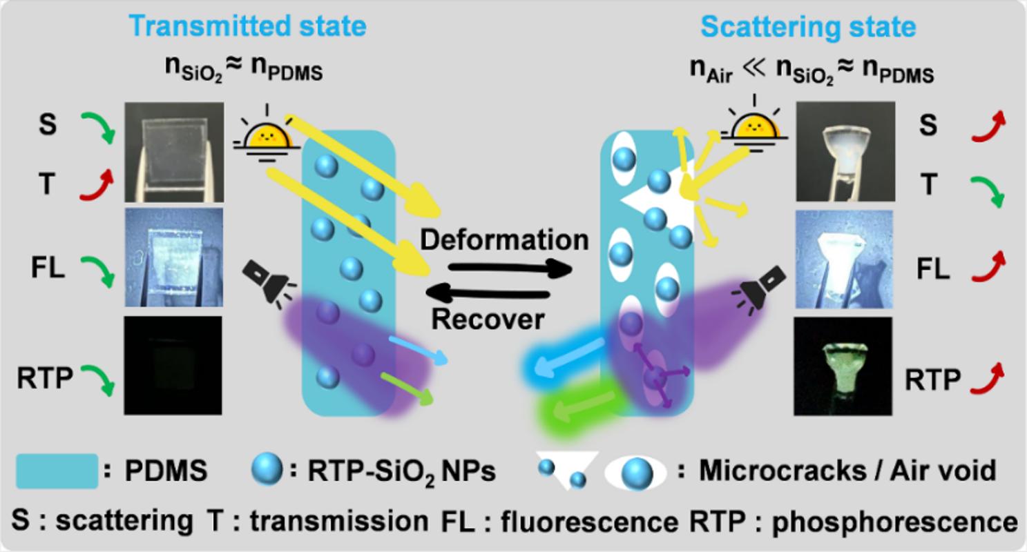 针对这一难题,西安交通大学物理学院研究人员创新性地提出了集成透射光、散射光、荧光(FL)和室温磷光(RTP)的多模式光学信号响应系统构建策略。通过高温煅烧包覆荧光碳点(CDs)的单分散SiO₂纳米球(SiO₂ NPs),成功制备出兼具单分散特性、均匀球形形貌与长寿命室温磷光的RTP-SiO₂ NPs,实现了物理光调制结构与化学发光的有效兼容。进一步将RTP-SiO₂ NPs与聚二甲基硅氧烷(PDMS)复合,构建了多光学形态集成的弹性体(MOME)。在外力拉伸或挤压作用下,材料内部微裂纹和微空隙的形成导致折射率失配,使MOME呈现从透明态向白色散射态的可逆转变。尤为突出的是,形变诱导的散射增强显著提升了材料的FL和RTP发光强度。此外,MOME还展现出独特的动态调控特性,包括磷光衰减过程中的形变调控效应、溶剂-形变协同响应的光学开关行为等。据文献调研,这是目前首例实现形变诱导FL与RTP自散射增强且动态可逆调控的报道。