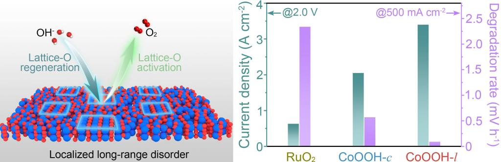 针对上述挑战,西安交通大学化工学院赵旭研究员团队提出了一种简便的氟介导稳定重构策略,在电解水制氢阳极工作条件下实现了重构非晶态CoOOH纳米片的长程无序规整化调控。该策略通过提前埋入氟离子强化Co-F键,在工况重构过程中有效稳定晶格钴位点,从而诱导形成具备更为规整原子排布的非晶结构。研究表明,这种规整化的长程无序结构不仅增强了Co-O共价性并触发晶格氧反应机制,还引入大量拉伸应变作为“氧泵”加速晶格氧的再生,从而实现了晶格氧活化与再生的平衡。因此,在阴离子交换膜电解槽制氢过程中,采用该催化剂的电解槽的制氢电流相较于商用贵金属催化剂提升5倍,耗电量仅为3.7度电/标方氢气,并在80℃和工业电流密度下连续运行1200小时后性能几乎无衰减。该研究为在工况条件下精准调控催化剂重构行为提供了新思路,对推动高性能阴离子交换膜电解水制氢技术发展具有重要意义。
