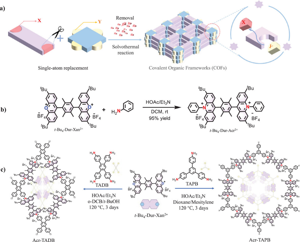 图1 通过单原子骨架编辑合成共轭有机框架材料:a) 用于COF合成的单原子编辑策略示意图;b) 模型反应展示单原子氧-氮置换过程,生成吖啶盐t-Bu4-Dur-Acr2+;c) 以t-Bu4-Dur-Xan2⁺与TADB或TAPB连接子构建吖啶盐基COFs。