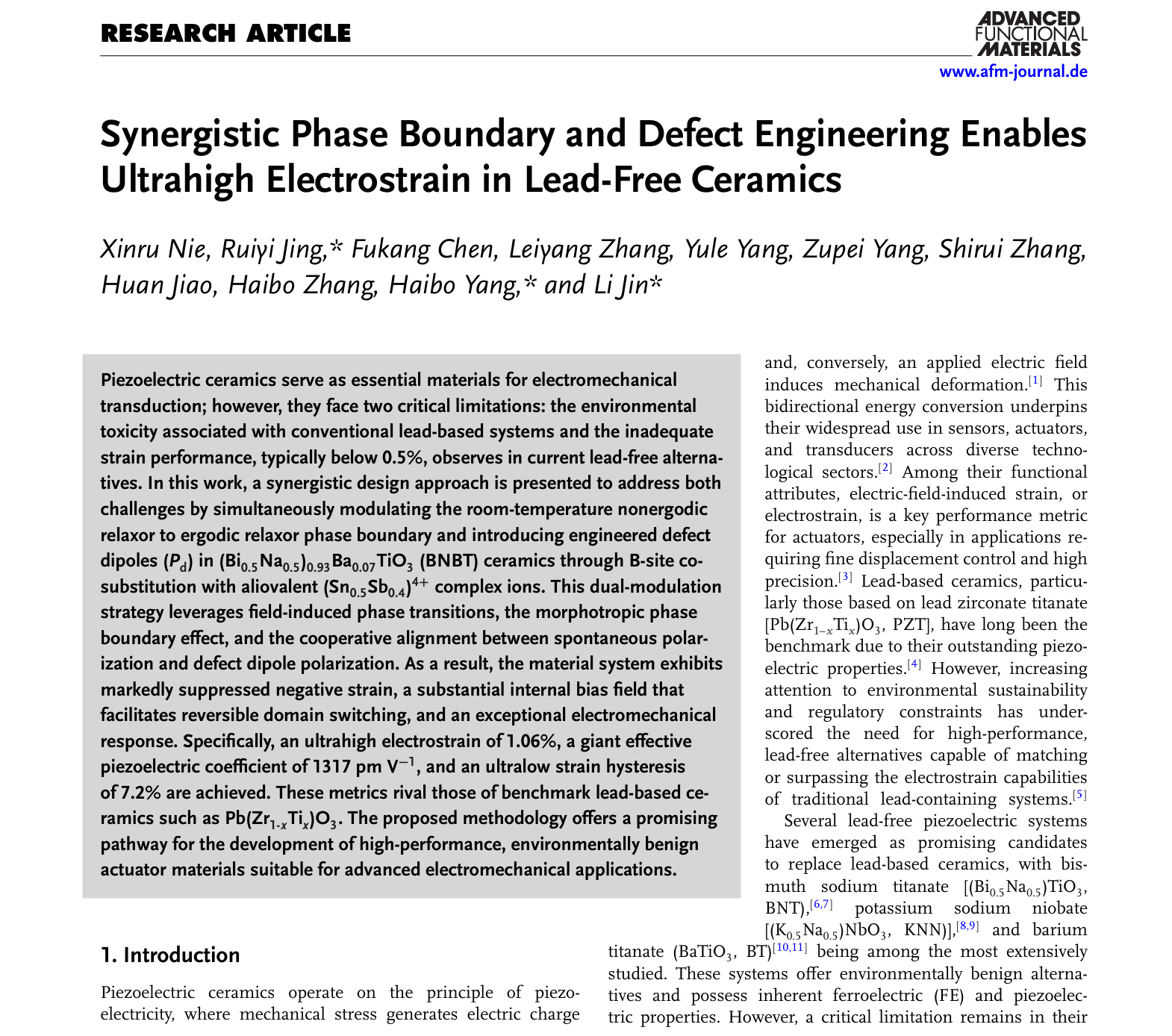 针对上述挑战,西安交通大学的研究团队创新性地提出了一种“相界与缺陷工程协同”策略,即在调控材料室温下非遍历弛豫相与遍历弛豫相(NER–ER)相界的同时,引入缺陷偶极子以优化其机电性能。这一突破性进展为开发适用于先进机电系统的高性能环境友好型驱动材料提供了极具前景的设计思路。相关研究成果以《协同相界与缺陷工程实现无铅陶瓷超高电致应变》(“Synergistic Phase Boundary and Defect Engineering Enables Ultrahigh Electrostrain in Lead-Free Ceramics”)为题,发表于《先进功能材料》(Advanced Functional Materials)上。