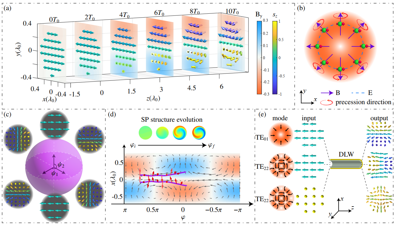 图1:在波导中利用太赫兹产生结构极化轻子束。(a)轻子束自旋在与TE01模式相互作用过程中的时间演化。(b)轻子自旋进动与空间磁场匹配示意图。(c)波导模式为TE01模时极化结构的庞加莱球表示。(d)在TE01模式下,轻子自旋相对于太赫兹相位在x-z平面上的演化。(e)不同自旋极化模式匹配产生的极化结构。