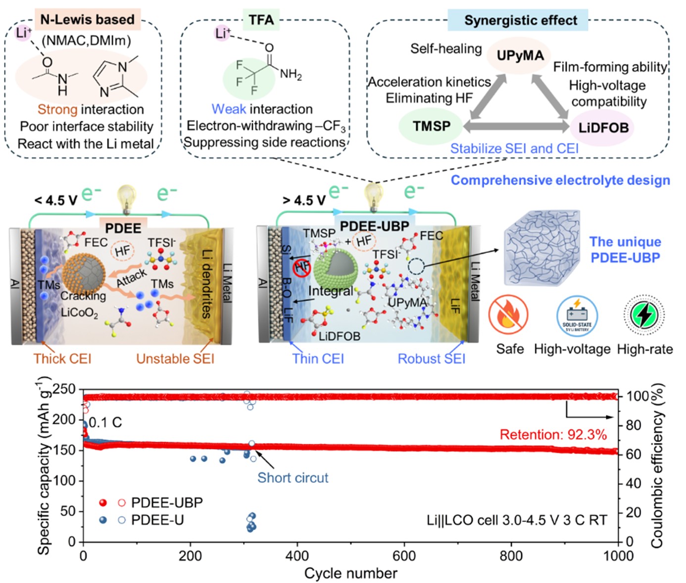针对上述难题,西安交通大学先进储能电子材料与器件研究所徐友龙教授研究团队提出“分子协同工程”的创新策略,提出了一种基于氟化酰胺的深共晶凝胶聚合物电解质(PDEE−UBP),兼具高安全性、快速离子传输与宽电压稳定窗口。通过对含氟深共晶体系实施原位聚合,电解质获得了优异的本征阻燃性与界面兼容性,显著降低了安全风险。此外,针对凝胶聚合物电解质在界面稳定性和高压适配性方面的不足采用三元协同添加剂策略调控分子间协同作用,在界面化学调控、溶剂化结构优化及宏观电化学性能之间实现了分子层级的精确耦合,构筑了化学稳定、富无机物的固态电解质界面结构,从而实现了高电压兼容与长期循环稳定的统一,为发展高安全、高能量密度的下一代锂金属电池电解质体系提供了新的设计范式与理论依据。实验结果表明,PDEE−UBP电解质表现出优异的综合性能:离子电导率为2.83 mS cm−1(25 °C),电化学窗口为5.6 V,满足所有高电压正极的需求,且锂离子迁移数高达0.68。采用该电解质的4.5 V钴酸锂电池在3 C倍率下循环1000次后具有92.3%的容量保持率,展现了优异的快充性能和循环稳定性。