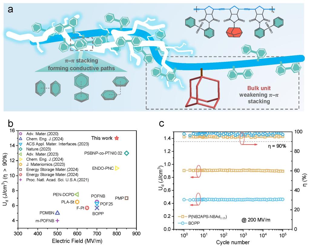 聚合物薄膜电容器因其超高功率密度和快速充放电能力,在新能源汽车、脉冲功率系统等领域应用广泛。然而,常用于制备该类电容器的商用双向拉伸聚丙烯(BOPP)等材料,存在介电常数低(εᵣ~2.2)、击穿强度弱(BDS~600 MV/m)的瓶颈。芳香族聚合物(如聚酰亚胺,聚碳酸酯等)虽具备高绝缘性,但其强π-π堆叠效应会导致高场下电导损耗剧增,严重制约其储能密度提升。因此,开发兼具高储能密度、高充放电效率和优异稳定性的聚合物电介质材料,是当前聚合物电容储能领域面临的重大挑战。