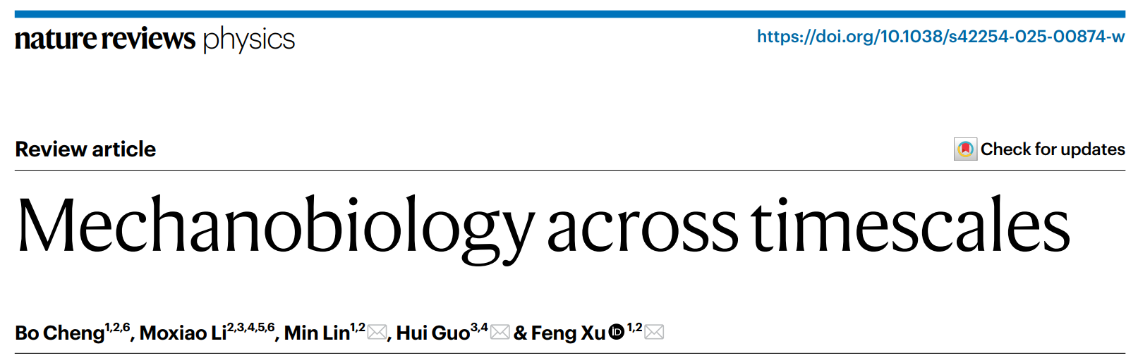 该成果以《跨时间尺度的力学生物学》(“Mechanobiology across timescales”)为题在《自然综述 物理》(Nature Reviews Physics)上在线发表。西安交通大学生命学院程波及李墨筱为论文第一作者,西安交通大学生命学院徐峰教授、林敏教授及西安交通大学第二附属医院郭卉教授为共同通讯作者。该研究得到国家自然科学基金重点/面上项目、中央高校基本科研业务费等项目以及教育部生物医学信息工程重点实验室、国家医学攻关产教融合创新平台等的支持。