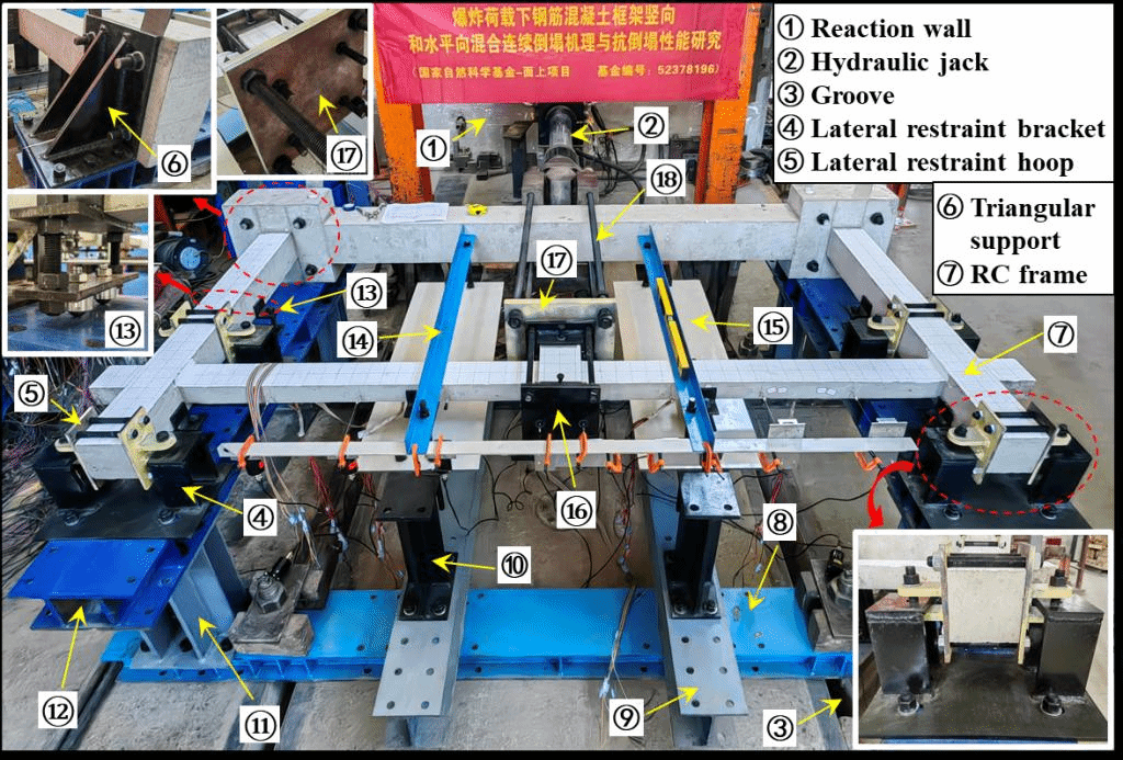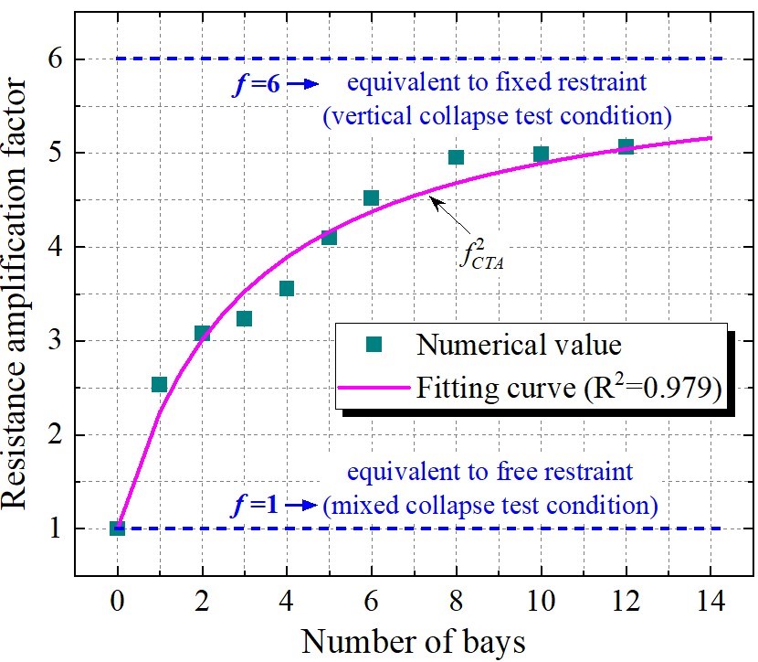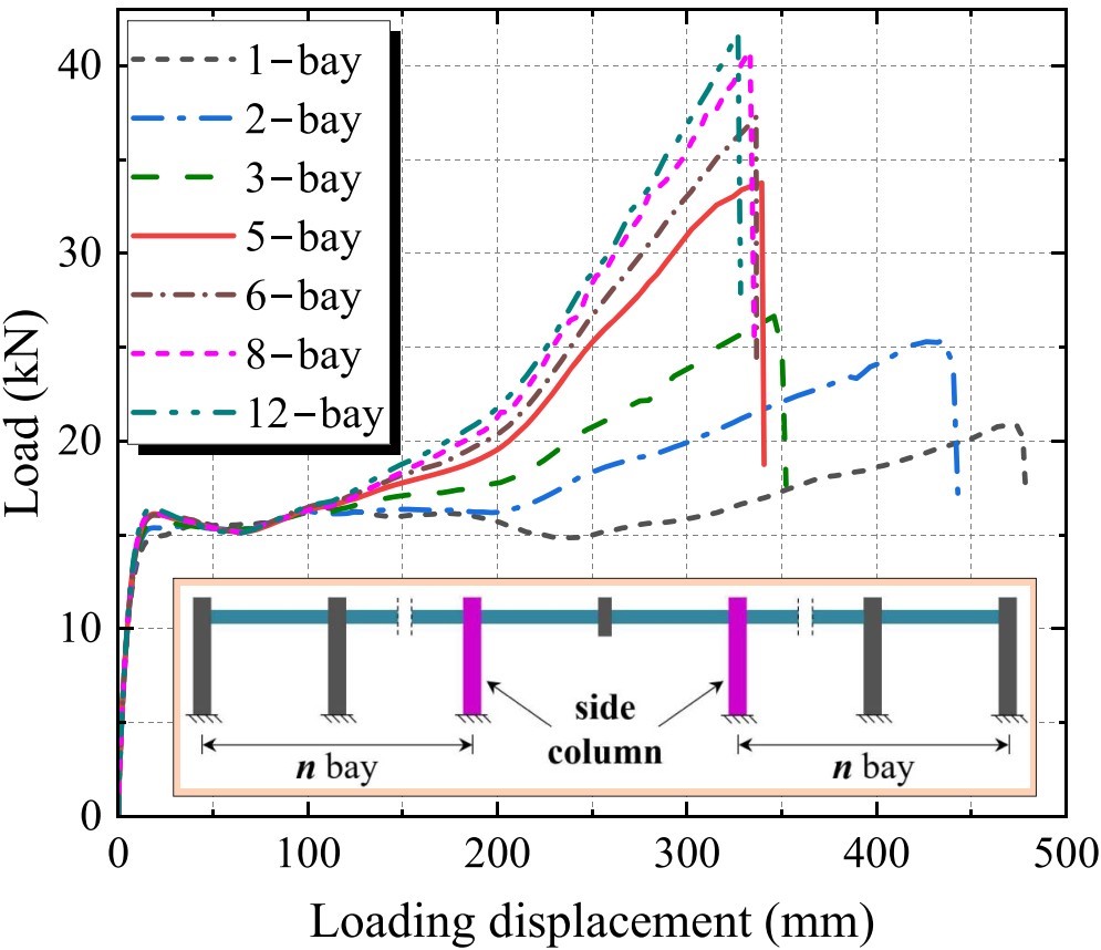 为解决上述问题,西安交通大学侯健教授团队采用新型卧式加载装置和边柱侧向约束装置开展了钢筋混凝土平面框架的连续倒塌试验和有限元分析。首先在试验研究中分别给边柱设置固定和自由两种侧向约束条件,对比钢筋混凝土平面框架在水平-竖向混合连续倒塌和竖向连续倒塌两种工况下的倒塌抗力、破坏模式和钢筋应变发展规律等。然后根据失效中柱在框架结构中所处的位置,考虑与边柱相邻的框架布置对边柱的侧向约束作用,采用有限元方法分析了相邻框架的跨数布置对钢筋混凝土平面框架倒塌抗力的影响。最后结合试验中的两组极端约束工况和有限元分析中的其他约束工况,拟合了钢筋混凝土平面框架的峰值抗力放大系数随相邻框架跨数的变化规律。结果表明,钢筋混凝土平面框架在自由侧向约束条件下水平-竖向混合连续倒塌的抗力峰值仅为竖向连续倒塌的0.28倍;与竖向连续倒塌相比,钢筋混凝土平面框架在水平-竖向混合连续倒塌工况下的最终破坏位置由中间梁-柱节点转移到了边柱;随双边相邻框架跨数的增加,边柱所受到的侧向约束作用从自由约束逐渐转变为固定约束,钢筋混凝土平面框架的倒塌行为由水平-竖向混合连续倒塌逐渐转变为竖向连续倒塌,其倒塌抗力峰值呈非线性增长,且增长速率逐渐减小;本研究所提出的峰值抗力放大系数的变化规律与试验和有限元分析结果保持一致,可为钢筋混凝土平面框架的防倒塌设计和性能评估提供有效参考。