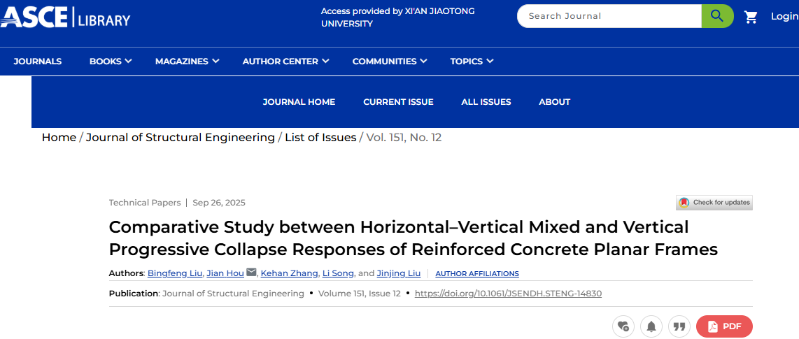 近日,研究成果以《钢筋混凝土平面框架水平-竖向混合和竖向连续倒塌响应的对比研究》(Comparative Study between Horizontal-Vertical Mixed and Vertical Progressive Collapse Responses of Reinforced Concrete Planar Frames)为题发表在美国土木工程师协会(American Society of Civil Engineers, ASCE)创办的权威期刊《结构工程期刊》(Journal of Structural Engineering)上。该期刊创刊于1983年,是结构工程领域最古老和被认可度最高的期刊之一,近3年年均发文量仅272篇。人居学院侯健教授为论文通讯作者,博士生刘秉峰为论文第一作者,西安交通大学是该论文第一作者单位和唯一通讯作者单位,该研究工作获得了国家自然科学基金面上项目和陕西省重点研发计划项目的共同资助。