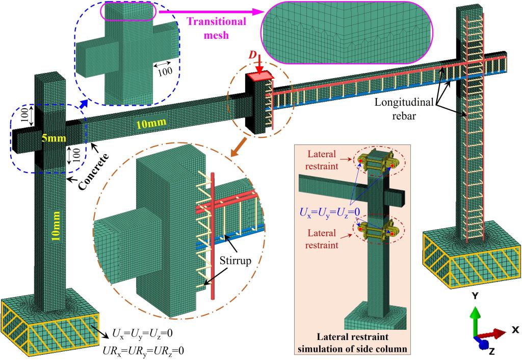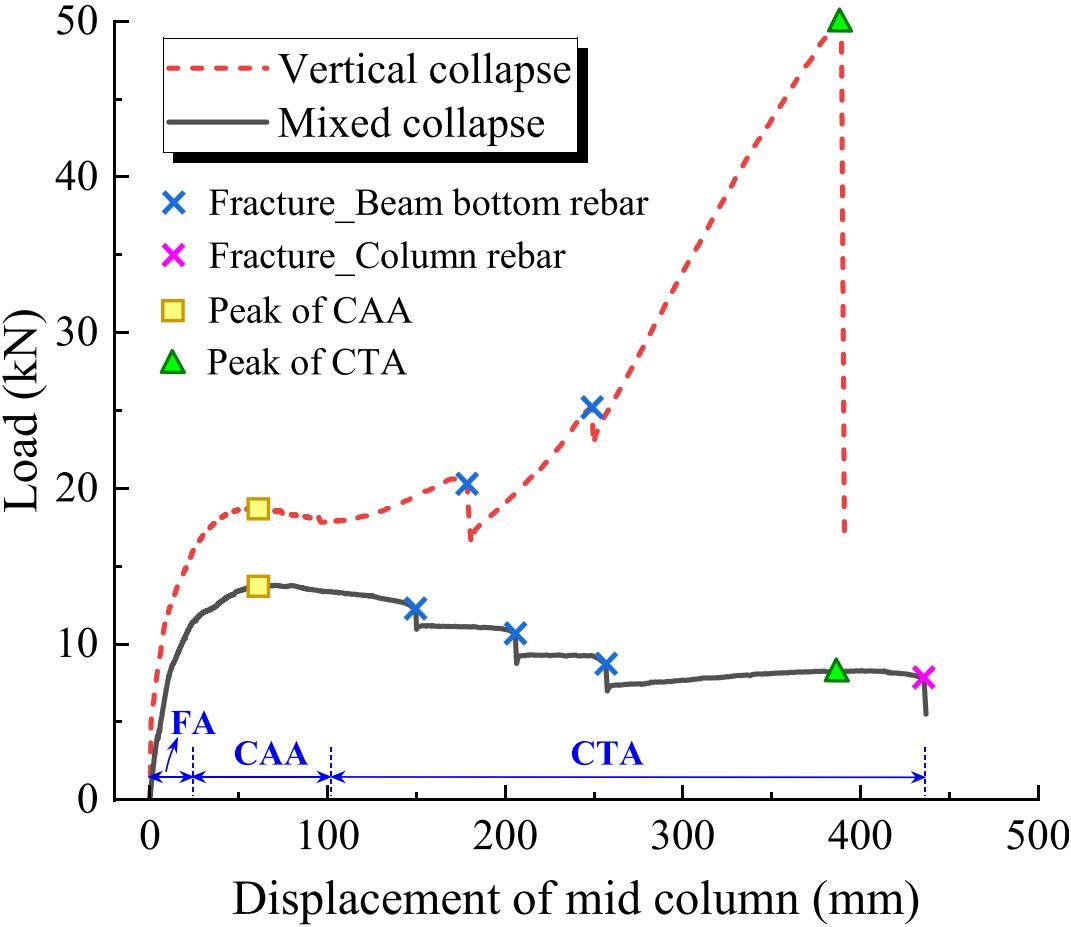 框架结构局部构件的失效会使既有荷载向邻近构件上传递,若相邻构件无法满足承载需求则会发生接连失效,致使框架结构产生与初始破坏不相称的大规模连续倒塌。连续倒塌具有显著的突发性、不确定性、强破坏性等特点,严重影响着框架结构的正常使用和居民的生命财产安全。既有研究在评估钢筋混凝土平面框架的抗连续倒塌性能时,均将边柱的侧向约束条件简化为固定约束,不考虑边柱在倒塌过程中的水平向受力和变形,仅分析钢筋混凝土平面框架的竖向连续倒塌行为。然而边柱在倒塌过程中会承受显著的水平向荷载,边柱侧向约束的不足会导致平面框架的连续倒塌方向由竖向朝水平向转移,即钢筋混凝土平面框架发生水平-竖向混合连续倒塌。就危害性而言,与竖向连续倒塌相比,水平-竖向混合连续倒塌在框架结构中涉及的区域更广,灾害性更加严重;就倒塌抗力而言,与竖向连续倒塌相比,水平-竖向混合连续倒塌会限制钢筋混凝土平面框架抗力峰值的发展,钢筋混凝土平面框架的倒塌抗力峰值会明显低于竖向倒塌,然而目前仍缺乏钢筋混凝土平面框架水平-竖向混合连续倒塌行为和抗倒塌性能的相关研究。