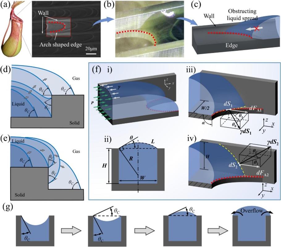 自2016年猪笼草口缘流体单向引导性被发现以来,其表面独特的弓形盲孔微结构,一直是众多流体调控研究的热门仿生对象。然而,为什么猪笼草口缘表面微结构呈现弓形,近十年来科学界一直没有很好的解释。如何恰当地设计弓形弧度,实现流体高效引导甚至是选择性调控,对于理解毛细驱动、润湿能量转化及液体调控机理具有重要意义。