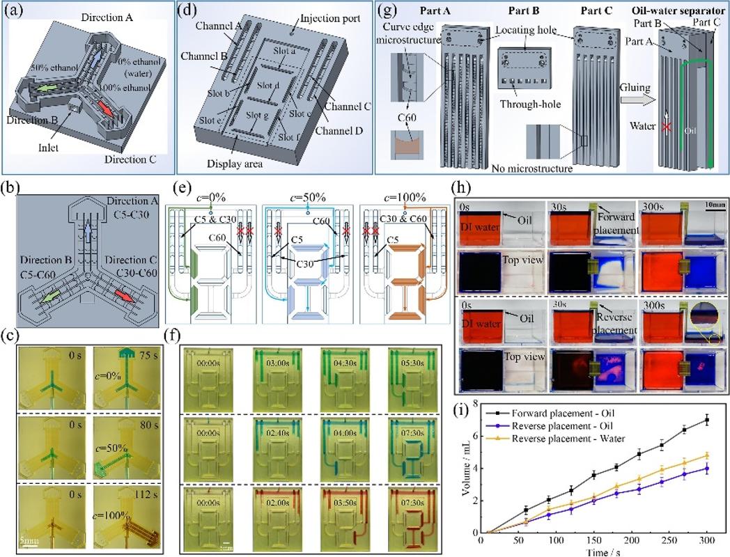 针对上述问题,西安交大机械工程学院张辉副教授团队提出了基于最小作用原理(最小能量法)的高曲率弓形边缘设计方法,获得了不同条件下的最优阻碍弓形曲线,从能量角度揭示了弓形边缘对于液体在沟槽内的最大阻碍作用机理,并提出了不同接触角下弓形曲线设计方法与准则。该研究揭示了2016年以来学界未能解释的弓形结构对流体作用机理问题。基于上述理论,研究团队设计并构建了多种功能性微流控器件,包括Y型分支通道、流体数字显示器和油水分离器。其中,Y型分支通道能够利用接触角差异实现液体在支路间的选择性分流;流体数字显示器通过不同液体在不同通道中的路径走向,形成不同的数字图案显示;油水分离器依靠弓形边缘的润湿差异实现无外场高效油水分离,其5分钟分离效率可达约98%。该研究为微流控系统中液体的定向输运、多向调控及智能筛分提供了新的结构策略与设计思路。