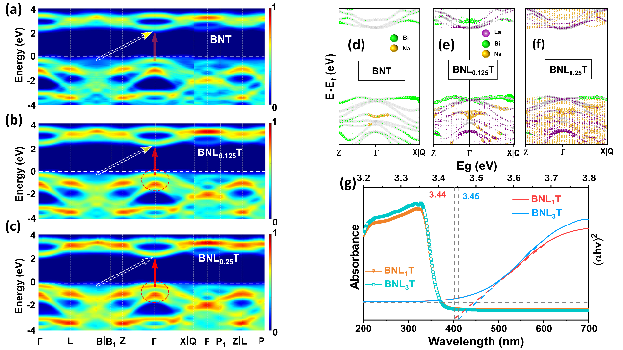 图 2. BNLxT 电子结构分析。(a)-(c)BNT、BNL0.125T 和 BNL0.25T 的反折叠能带结构。(d)-(f)G点附近分别在 La、Bi 和 Na 上能带投影,对应于(d) BNT、(e) BNL0.125T 和 (f) BNL0.25T。(g) BNL1T 和 BNL3T 样品的紫外-可见吸收光谱以及用于计算带隙的Tauc图。