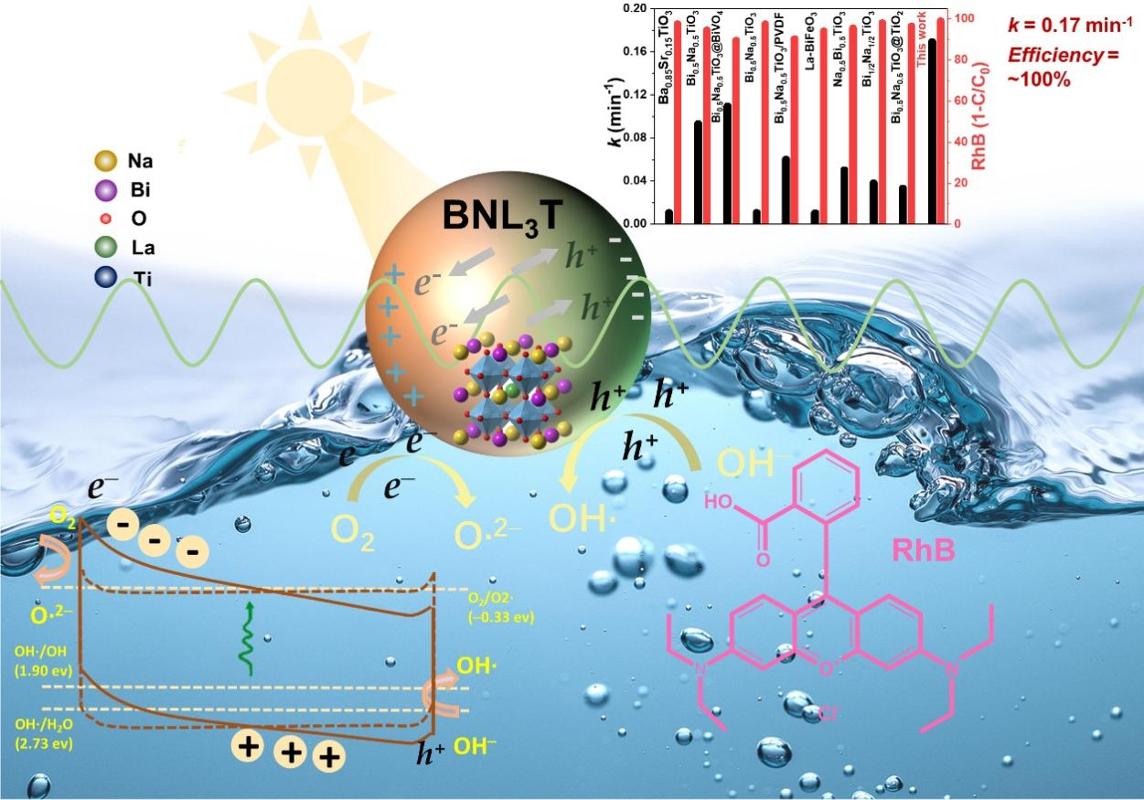 近日,张乐研究员研究小组报道了一种新型无铅环保La掺杂(Bi,Na)TiO₃(BNL3T)铁电纳米粒子,通过光致发光光谱(PL)对BNL3T压电光催化降解RhB溶液的效率进行测试,其可在极短的反应时间(<30 分钟)内对常用染料罗丹明b(rhb)实现了接近100%的降解率(如图1所示),结果显示其性能优于目前所有同类材料。值得注意的是,该反应的一级速率常数(k="0.17" min⁻¹)较传统基于bifeo3(BFO)和BaTiO3(BTO)体系的压电或光催化剂高出一个数量级,为有机污染物的快速降解提供了新方向。 图2所示的密度泛函理论(DFT)计算表明,该材料优异的催化性能源于两个关键因素:1)通过在La位点的直接电子激发增强了电子参与度;2)由于La掺杂过程中极化幅度的增加,其高的内在电场提高了电子-空穴分离效率。本研究通过稀土元素掺杂同时调控无铅铁电纳米材料极化与能带结构,为设计高性能环境催化剂提供了可行的思路与方法。