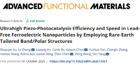 上述研究成果近期以《采用稀土调控能带/极化结构实现无铅铁电纳米颗粒的超高压电光催化效率与速率》(Ultrahigh Piezo-Photocatalysis Efficiency and Speed in Lead-Free Ferroelectric Nanoparticles by Employing Rare-Earth Tailored Band/Polar Structures)为题,发表于国际权威期刊《先进功能材料》(Advanced Functional Materials)。西安交通大学物理学院为第一通讯单位,物理学院博士生许书源为论文第一作者,张乐特聘研究员为论文共同第一作者和通讯作者。其他共同通讯作者还包括西北有色金属研究院陈凯运高级工程师、香港理工大学陈子斌教授和西安交通大学物理学院杨森教授。本工作得到了国家重点研发计划、国家自然科学基金,中国博士后基金、西安交通大学青年拔尖人才计划等项目资助。同时感谢西安超算中心为本研究提供的计算资源支持。