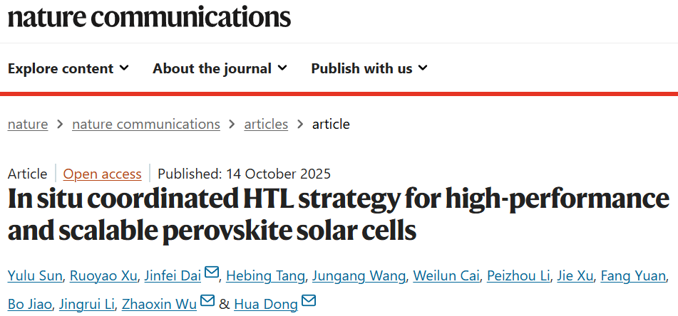 上述研究近期以《用于高性能和可扩展的钙钛矿太阳能电池的原位协调HTL策略》(In situ Coordinated HTL Strategy for High-Performance and Scalable Perovskite Solar Cells) 为题发表在国际顶级期刊《自然·通讯》(Nature Communications)上,西安交通大学电子科学与工程学院为第一通讯单位。课题组博士生孙郁露和许若尧为共同第一作者,代锦飞副教授、吴朝新教授、董化教授为共同通讯作者。该工作得到了国家重点研发计划、国家自然科学基金的资助,论文测试表征得到了西安交通大学大型仪器设备共享测试中心支持。吴朝新教授团队长期研究新型功能材料的“光-电”与“电-光”物理机制及其器件应用如太阳能电池、发光二极管、光电探测器等。