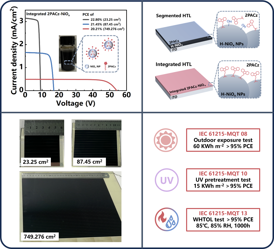 采用这种HTL的钙钛矿太阳能电池实现了26.02 %的最高效率(有效面积为 0.0655 cm2),而大面积组件效率在23.25 cm2时达到22.80 %,87.45 cm2时达到21.45%, 749.276 cm2时达到20.21 %(认证效率为19.50 %),显示出卓越的可扩展性。此外,商业应用的关键关注点——辐照和热稳定性,也得到了显著改善。封装后的大面积组件成功通过了 IEC 61215-2-2021标准中的三项组件质量测试(MQT):户外暴露(MQT 08)、紫外线预处理(MQT 10)和湿高温工作寿命(MQT 13)测试。