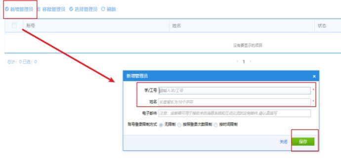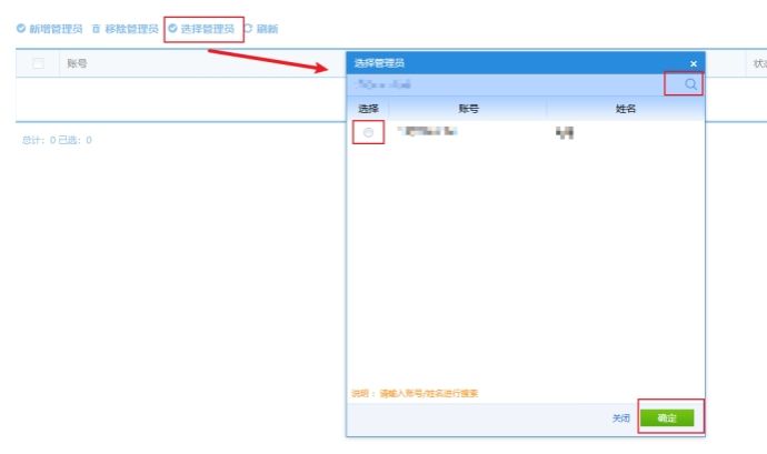 选择管理员,在弹出的选择管理员窗口,输入您要授权的账号,点击检索图标,在检索结果列表中勾选然后点击保存即可。