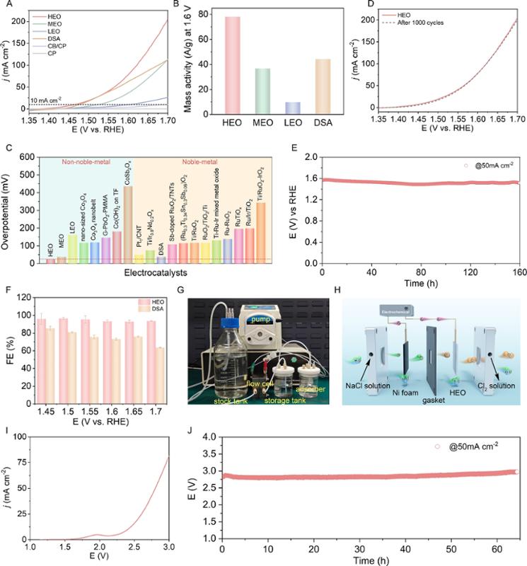 团队随后采用1173 K固相煅烧法成功合成出纯相十元MSb2O6高熵氧化物,并通过XRD、HAADF-STEM和ICP-OES确认其为均一分布的三金红石结构。应力分析进一步揭示该体系具有显著的晶格应变,从而弱化了金属-氧键、增强了电子迁移与中间体吸附能力,显著加快Cl-的电化学氧化动力学。在4 M NaCl-HCl电解体系中,十元高熵催化剂在10 mA cm-2时过电位仅24 mV,具有超过95%的法拉第效率以及160小时无衰减稳定性。其质量活性高达78.1 A g-1,是商用DSA的约两倍,而成本仅0.46美元/m2,体现出显著的工业应用潜力。机理分析表明,该体系遵循Cl吸附路径而非OCl路径,Cu位点周围的高熵环境与氧空位协同降低了反应能垒。密度态计算也显示该材料在费米能级附近具有高电子态密度,有利于电子转移与中间体吸附。