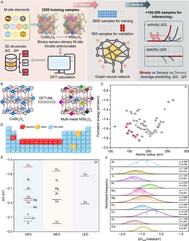 针对这一挑战,西安交通大学第一附属医院MED-X研究院再生与重建医学研究所吕毅教授、刘晓菲副研究员以及动力工程多相流国家重点实验室沈少华教授等多学科团队提出了原子级“熵引导”(entropy-guided)材料发现策略,从单一的CoSb2O6结构出发,通过DFT系统计算不同金属取代后形成能与晶格兼容性,从元素周期表中筛选出10种金属构建可稳定共存的高熵体系(MSb2O6,M = Mg, Ti, V, Cr, Mn, Fe, Co, Ni, Cu, Zn)。进一步结合图神经网络(GNN)与蒙特卡洛采样,在105个可能构型中预测出最具热力学与电催化优势的组合,揭示高熵材料的多组元无序结构可降低体系自由能(ΔG = ΔH − TΔS)并优化活性位的电子分布。理论计算表明,随着金属组元由2、6到10种逐步增加,反应能垒不断降低,Cu位点成为最优活性中心。