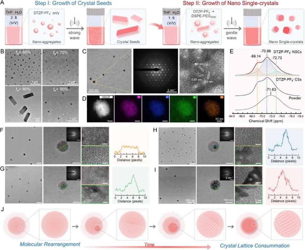 图2.DTZP-PF₆⁻ NSCs的制备过程、形貌、尺寸和元素分布,以及通过TEM图像动态监测晶体生长过程
