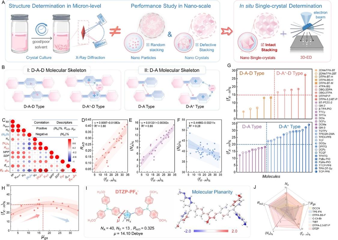 图1.有机纳米单晶光敏剂的分子设计策略,包括对已报道光敏剂的分类、结构参数与氢键比例的相关性分析,以及新设计的DTZP-PF₆⁻的分子结构和性能对比