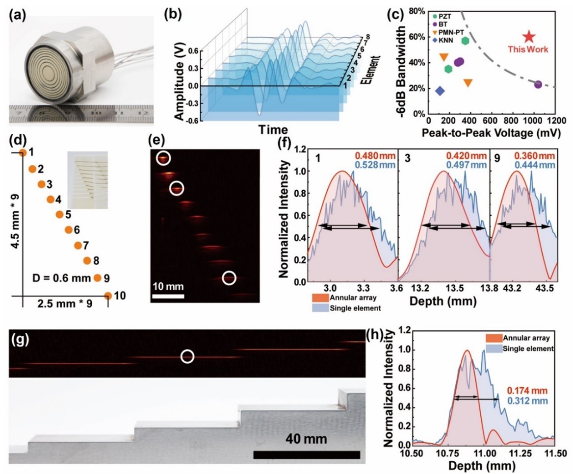 (a) 3D打印的8环阵列换能器 (b,c) 器件表现出优异的脉冲回波响应和带宽