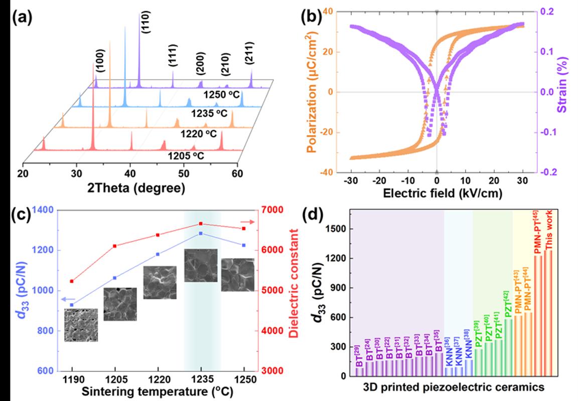 在解决了打印成型的难题后,研究团队通过精细调控脱脂与烧结工艺,获得了致密度高达95%以上、无裂纹的压电陶瓷。随后,对粉体粒径和烧结工艺进行了系统优化,研究了3D打印压电陶瓷的微观结构和电学性能。采用平均粒径为1.0 μm的粉体,在1235 ℃下烧结制备的3D打印Sm-PMN-PT陶瓷展现出较高的压电性能,其压电系数d₃₃高达1285 pC/N。
