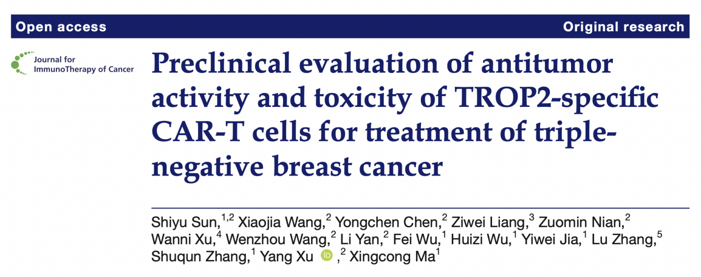 近日,西安交通大学第二附属医院乳腺疾病诊疗中心张淑群、马兴聪教授团队在免疫治疗领域顶级期刊《癌症免疫治疗》(Journal for ImmunoTherapy of Cancer)发表《TROP2特异性CAR-T细胞治疗三阴性乳腺癌的抗肿瘤活性及毒性临床前评价》(Preclinical evaluation of antitumor activity and toxicity of TROP2-specific CAR-T cells for treatment of triple-negative breast cancer)研究成果,首次揭示靶向TROP2的CAR-T细胞治疗三阴性乳腺癌临床前评估的新发现。