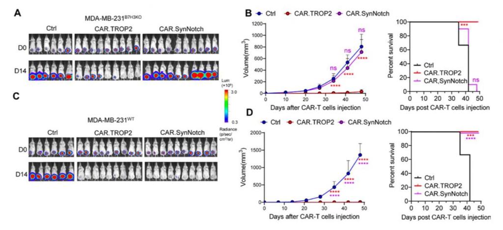 研究团队通过构建靶向TROP2的第二代CAR-T细胞(CAR.TROP2),通过系统的体外及体内实验,证实CAR.TROP2在多种TNBC细胞系、原位/转移模型及患者来源肿瘤异种移植(PDX)模型中均表现出强大的抗肿瘤活性,显著延长荷瘤小鼠生存。研究还首次利用人源化TROP2表达的免疫健全小鼠模型,评价了该疗法的安全性,并进一步提出创新性的安全门控方案。